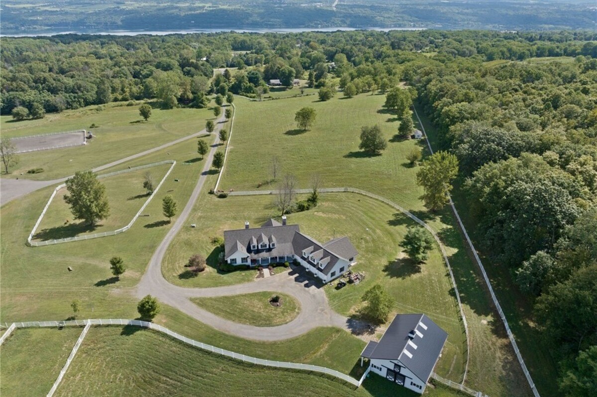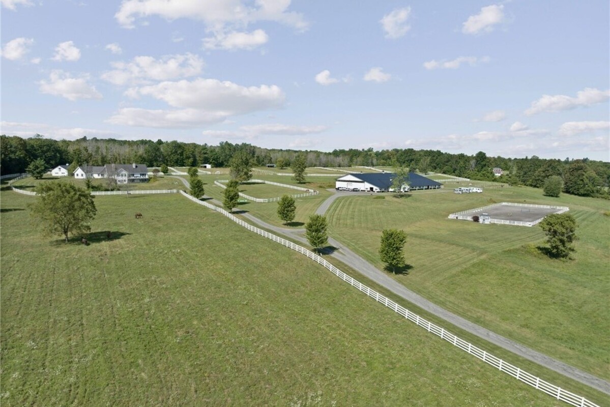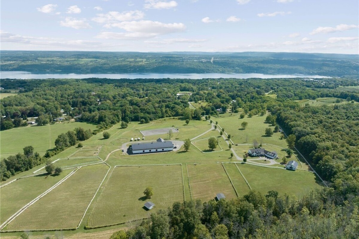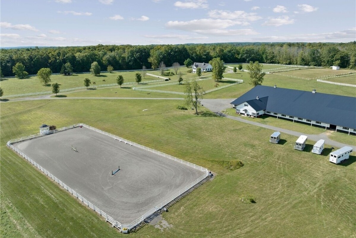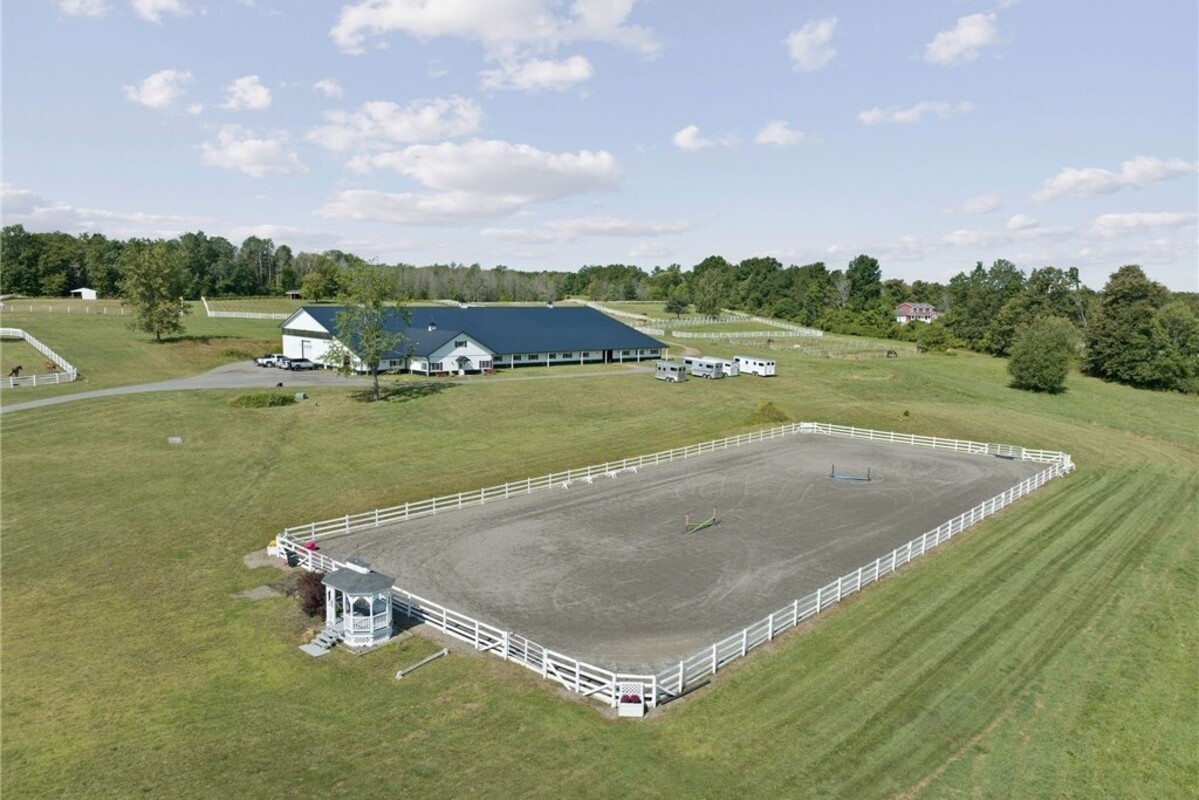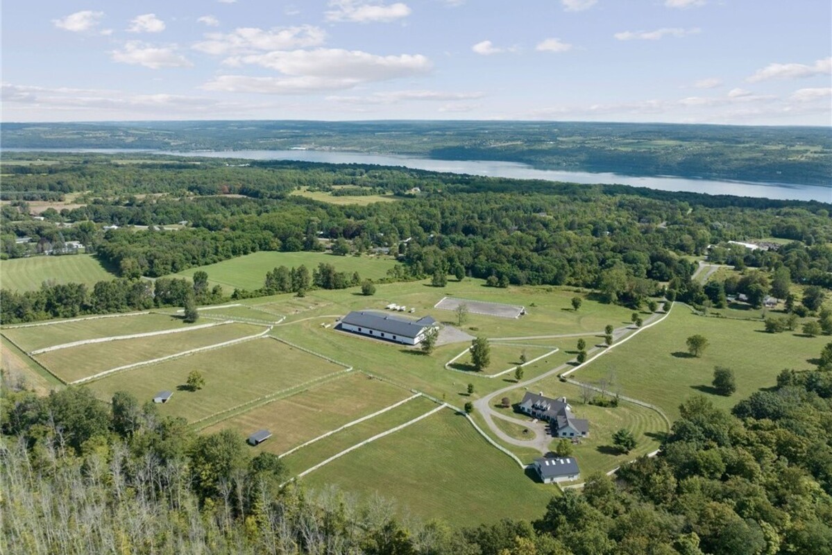 Hidden from view, yet just minutes from Cornell University, this gated equestrian estate offers a setting and opportunity unlike any other. Nestled on 72 terraced acres, a tree-lined lane bordered by white fencing leads to a premier horse facility that combines lifestyle, business, and beauty. Currently home to a thriving boarding operation, this elite center offers endless possibilities for the discerning equestrian. Whether boarding, training, lessons, showing, rehab, rescue, or personal enjoyment, any discipline will thrive here. The centerpiece is a 14 + stall barn with automatic waterers, fans, wash and grooming stalls, plus a heated office, meeting space, and client bathroom. Enjoy year-round riding in the attached 80x205 indoor arena and summer shows in the 100x230 outdoor arena with judge’s gazebo. Eight flex-fenced pastures, four smaller paddocks, and an additional 2-stall barn with storage offer ideal accommodations for horses. The custom 4-bedroom, 3-bath Cape-style home is designed for both comfort and elegance. A great room with living, dining, and cook’s kitchen opens to a wall of Pella windows and glass doors leading to a deck that overlooks the property. A sunroom captures peaceful views of the pastures, while the lower level and spacious attic provide expansion opportunities. The attached 3-car garage with workshop adds convenience and function. The terraced terrain is perfect for conditioning, with space for cross-country jumps and a two-mile perimeter trail. Explore 14 acres of woods and a 10-acre mowed meadow, ideal for riding, walking, or simply soaking in the beauty of the land. This is more than an equestrian property, it’s an unparalleled opportunity to live your passion, run a successful business, and create the equestrian lifestyle you’ve always envisioned, all in a premier location near Ithaca, Cayuga Lake, and the best of the Finger Lakes.