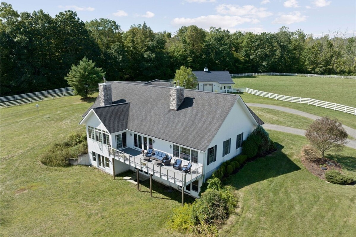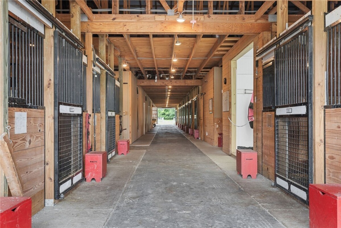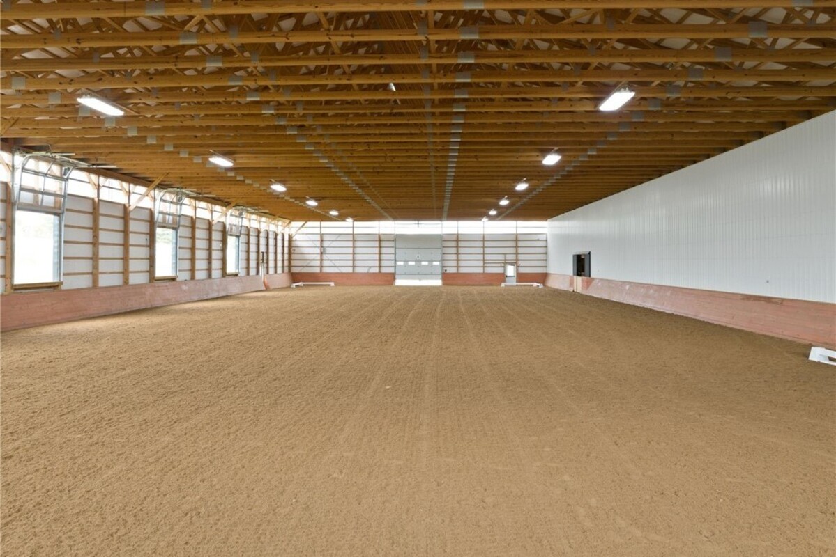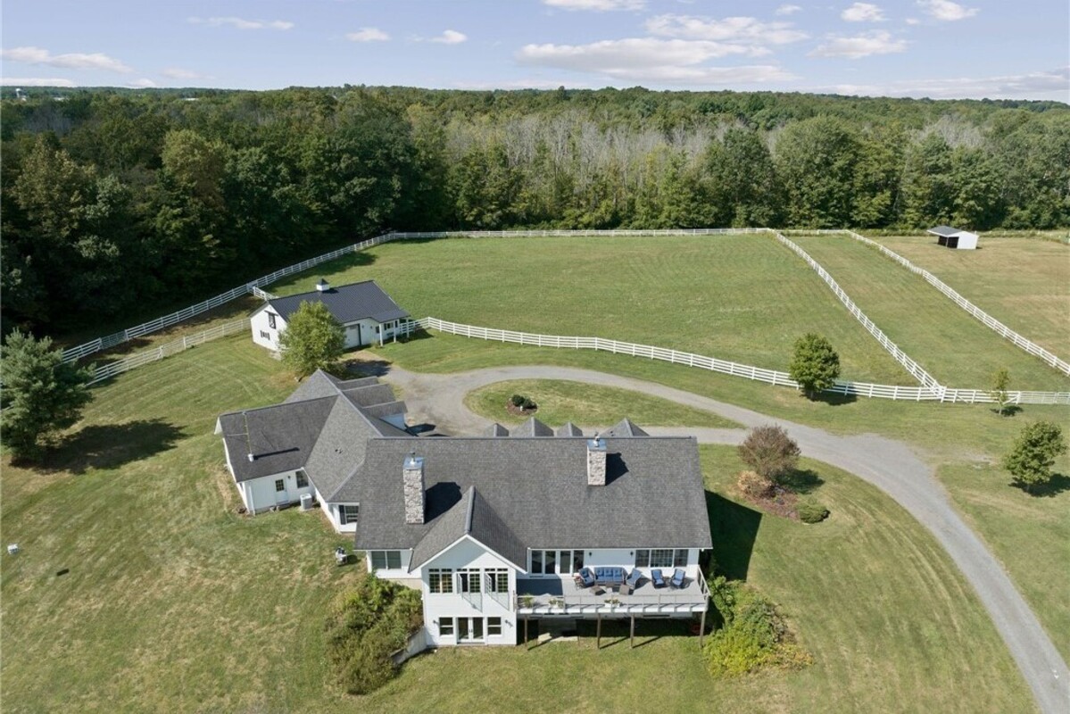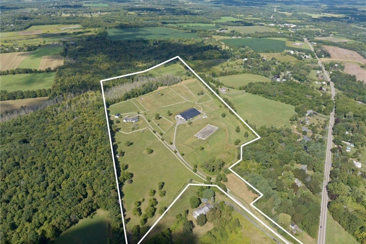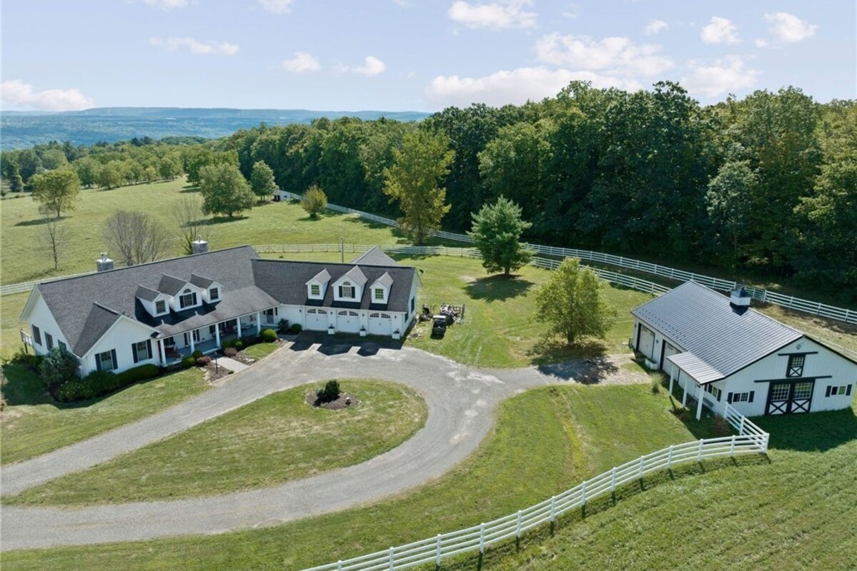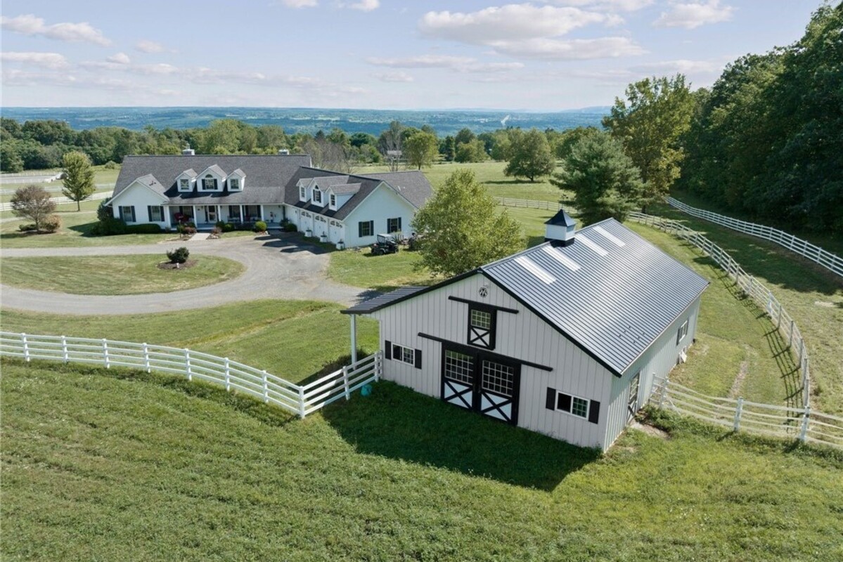 Hidden from view, yet just minutes from Cornell University, this gated equestrian estate offers a setting and opportunity unlike any other. Nestled on 72 terraced acres, a tree-lined lane bordered by white fencing leads to a premier horse facility that combines lifestyle, business, and beauty. Currently home to a thriving boarding operation, this elite center offers endless possibilities for the discerning equestrian. Whether boarding, training, lessons, showing, rehab, rescue, or personal enjoyment, any discipline will thrive here. The centerpiece is a 14 + stall barn with automatic waterers, fans, wash and grooming stalls, plus a heated office, meeting space, and client bathroom. Enjoy year-round riding in the attached 80x205 indoor arena and summer shows in the 100x230 outdoor arena with judge’s gazebo. Eight flex-fenced pastures, four smaller paddocks, and an additional 2-stall barn with storage offer ideal accommodations for horses. The custom 4-bedroom, 3-bath Cape-style home is designed for both comfort and elegance. A great room with living, dining, and cook’s kitchen opens to a wall of Pella windows and glass doors leading to a deck that overlooks the property. A sunroom captures peaceful views of the pastures, while the lower level and spacious attic provide expansion opportunities. The attached 3-car garage with workshop adds convenience and function. The terraced terrain is perfect for conditioning, with space for cross-country jumps and a two-mile perimeter trail. Explore 14 acres of woods and a 10-acre mowed meadow, ideal for riding, walking, or simply soaking in the beauty of the land. This is more than an equestrian property, it’s an unparalleled opportunity to live your passion, run a successful business, and create the equestrian lifestyle you’ve always envisioned, all in a premier location near Ithaca, Cayuga Lake, and the best of the Finger Lakes.